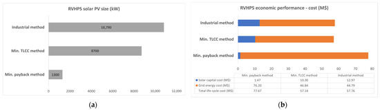 Solar PV sizes and economic performance for RVHPS: (a) Solar PV size obtained from the three methods; (b) Results of economic performance of the three methods.