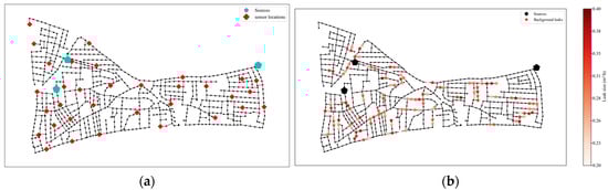 In Equation (4), and are the measured and simulated pressures of node ‘i’, respectively; and are the measured and simulated flows in pipe ‘j’, respectively.