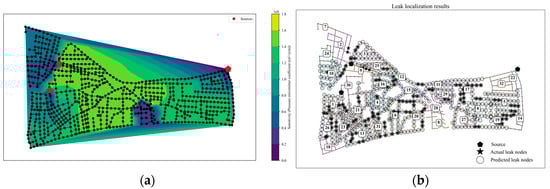 The contour map of nodal sensitivity values, clustering, and leak localization results are shown in Figure 3. To partially account for inaccuracies in the hydraulic model, the demands in the model are perturbed by 10% before use for leak localization. Nodes associated with different leak groups are represented by distinct colors in the corresponding Figure 3, with each leak group labeled at the top of its respective cluster.