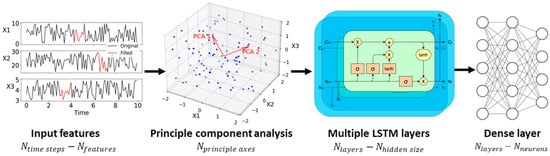Before feeding the previously mentioned input features to the model, a Principal Component Analysis (PCA) was employed to transform the original inputs into more descriptive features. This process reduces the dimensionality of the forecast problem from eight to five dimensions. Furthermore, hyperparameter optimization was conducted to fine-tune the parameters of the M-LSTM model on a district-metered area (DMA) basis. The PCA, hyperparameter optimization, and training of the M-LSTM model were coded in Python, leveraging the Scikit-learn, Hyperopt, and Pytorch libraries, respectively.