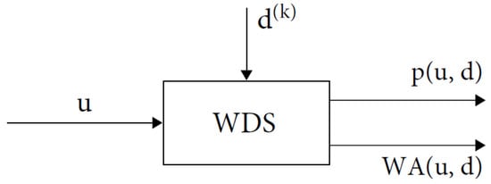 A WDS consists of pipes that connect water sources (e.g., reservoirs and tanks) to nodes (e.g., consumer households or industry demands). Our optimization aims to simultaneously minimize the total pressure and water age , which depend on the settings of the pressure-reducing valves (PRVs) and the uncertain demand , by adjusting the given PRVs [,], leading to the following chance-constrained optimization problem: