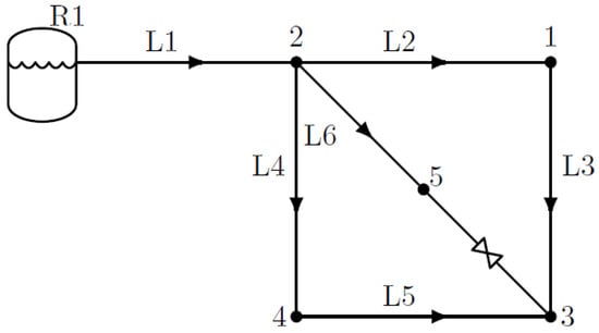 As a case study, we examine a simple gravity-based water distribution network consisting of one reservoir, five nodes, six pipes and a PRV located between nodes 5 and 3, as shown in Figure 2.