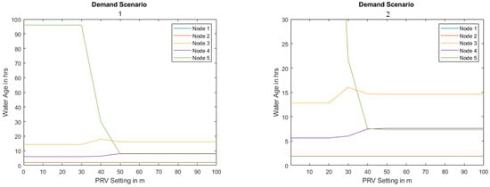 When comparing two scenarios with low consumption and high consumption at node 3, a peak in the water age curve (see Figure 4) is observed with the medium PRV settings (30–60 m). This can be explained by the fact that at a PRV setting = 30 m, the valve is virtually closed, causing the water age at node 5 to increase. By increasing the PRV setting to 50 m, the water age at node 5 is reduced, as water can now flow through the PRV at almost all demand values at node 3. However, the water age at node 3 increases with a higher PRV setting.