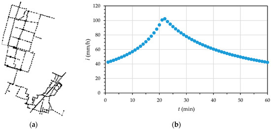 Case study network (a) and Chicago hyetograph (b) used in EPASWMM.