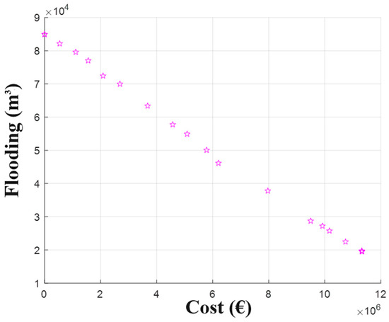 Pareto front of optimal solutions in the trade-off between costs and flooding volume.