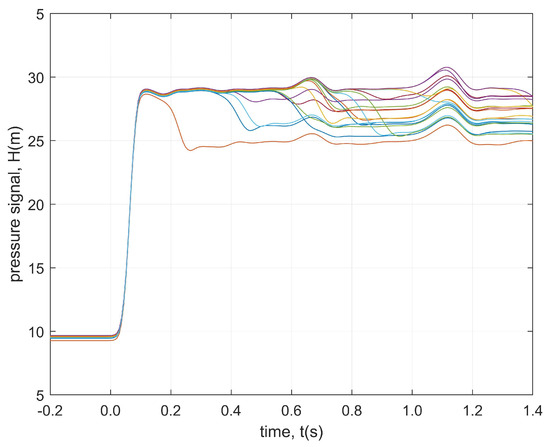 The first outcome proposed is the generation of the transient signals collected at the MP during the unsteady simulations with the main parameters randomly perturbated. The generation processes are performed in parallel with 20 workers, and it takes 183 min. Figure 1 shows twenty simulated signals with leaks in different positions.