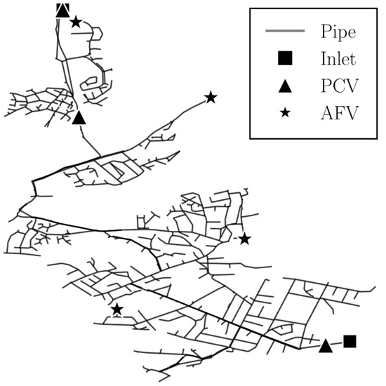 - Wright, R.; Abraham, E.; Parpas, P.; Stoianov, I. Control of water distribution networks with dynamic DMA topology using strictly feasible sequential convex programming. Water Resour. Res. 2015, 51, 9925–9941. [Google Scholar] [CrossRef]