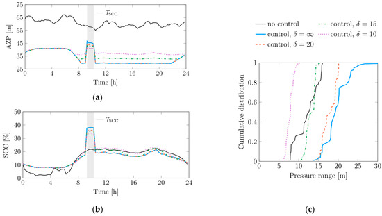 (a) AZP and (b) SCC objectives values across scheduling horizon ; (c) distribution of nodal pressure range for each experiment.