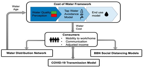 Water distribution systems (WDSs) are designed to equitably deliver clean and safe water to all end users, yet many fall short due to changing conditions. Demands and flows in WDSs are dependent on decisions of end users to increase or decrease water use. Demand reductions cause increases in water age near the location of the demand change, leading to local water quality deterioration [,]. Previous work has shown that COVID-19 social distancing caused changes in demands that resulted in increased water age, primarily in residential areas close to industrial sites []. Low-income and minority households have historically been located near industrial sites, raising equity concerns with respect to water quality. In response to reduced water quality, consumers may increase bottled water use, which leads to increased costs to access water for the end user. The complex interactions among water quality, bottled water buying decisions, and the hydraulic network supplying water requires a sociotechnical framework to capture the personal decision-making that is critical to the system.