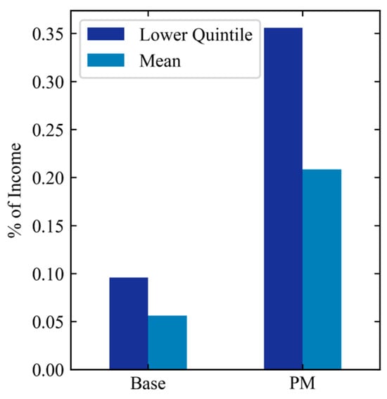 At the end of the simulation, the cost of water as a percentage of income is calculated for each household (Equation (1)) and is used to analyze potential inequities caused by water age.
