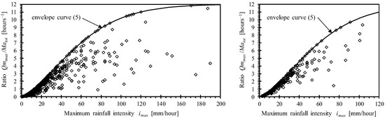 For imax tending to infinity, envelope (5) tends to the asymptote Qmmax/Matot = 1/Δt, which is 12 h−1 in the case under consideration, having adopted Δt = 5 min.