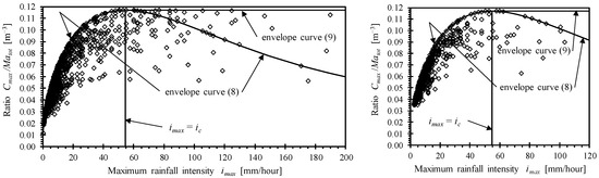 In other words, the increase in the intensities imax beyond the value ic, even assuming that these intensities occur at the beginning of the event (i.e., when Ma(t) = Matot), causes a progressive reduction in the Cmax/Matot value given by (7) due to the superior influence of the dilution effect over the leaching effect.