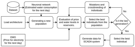 A flow chart of the water distribution network management process is shown in Figure 1. The main decision-making element is the genetic algorithm. This must be supplemented by the inputs of the water consumption expected on the following day (generated by the neural network), the electricity price according to the electricity market operator and, of course, the boundary conditions of the water distribution network (reservoir volumes, pump capacities and power inputs).