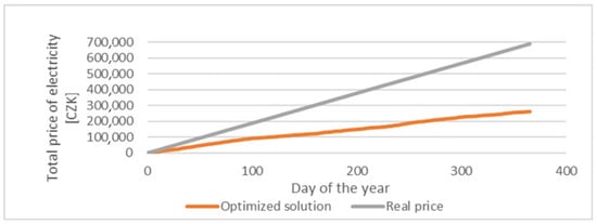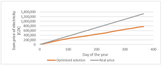An example of the output of the comparison of electricity prices for the full year 2023 is shown in Figure 2—in this case, it is the sum line of the price of electricity consumed for pumping and treating water for containment in water tank 1.