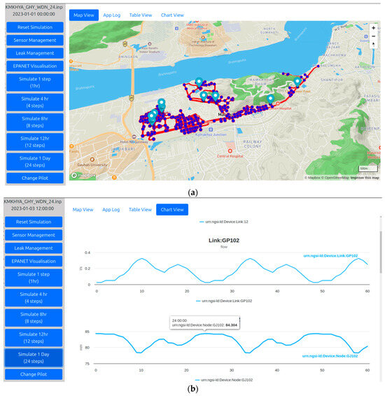 Figure 1. Digital twin application: (a) interactive view of WDN; (b) view of temporal data.