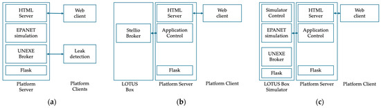 Figure 2 shows the three functional operations of the platform, with (a) showing the ‘normal’ leak simulation operation. The platform server component (to the left) maintains the model (FIWARE) and controller functionalities, allowing the Guwahati WDN to be simulated with EPANET and results stored in the UNEXE broker. The two platform clients (to the right) show how users can interact with the platform either as a web client or through the ngsi-ld/v1 interface for leak detection algorithm development.