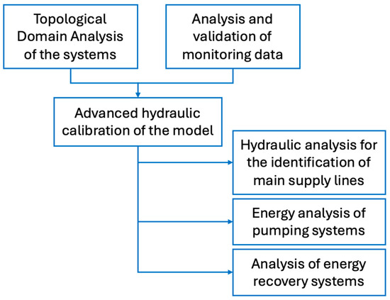 The methodology developed by the project is based on two complementary perspectives, focused on water and energy efficiency, which are considered integrated. In this context, advanced hydraulic modeling via the WDNetGIS-XL platform serves as a bridge between these two areas of efficiency. It provides insights into the hydraulic state of the system across various efficiency scenarios, jointly defined by researchers and AQP technicians based on operational, technical, and economic constraints. Figure 1 illustrates the sequence of technical steps undertaken for this study’s water network.