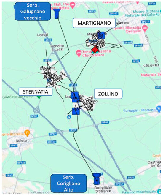 The case study selected by AQP focuses on the network that provides water to the municipalities of Sternatia, Martignano, and Zollino in southern Apulia (Figure 2). Currently, the system operates with two reservoirs: the Corigliano Alto and the Galugnano Vecchio reservoirs. In the proposed efficiency scenarios, the Galugnano Vecchio reservoir will be excluded. The Corigliano Alto reservoir receives water from a group of four wells, of which only one is in constant operation. Additionally, the system includes three pressure control valves (PCVs), one at the entry point of each municipality.