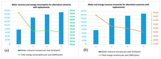 These indicators are based on an analysis conducted over a 120 h operational cycle (selecting 5 days from the data provided by AQP). Figure 3a,b visualize the different alternative scenarios regarding water savings achievable through asset management actions, associated energy consumption for pumping, and total recovery potential. The scenarios depicted in the figure are exclusively related to pipeline replacement. It is noted that optimizing pressure control alone can lead to the recovery of more than 75,000 cubic meters of water per year. When this optimization is combined with replacing pipes at a rate exceeding 16% (as seen in scenario 3), the water savings increase to more than 140,000 cubic meters per year. Note that water saving decreases energy recovery. Using the data in Table 2, managers can assess the budget required to implement asset management actions and estimate impact in terms of water and energy savings for each scenario.