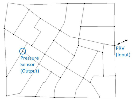 The Fossolo network represents a single district meter area (DMA), as depicted in Figure 1. The network has one inlet, regulated by a PRV that governs the inlet head. It comprises 36 demand nodes with a total demand fluctuating between 24 and 42 L/s. The objective is to control the PRV setting to ensure minimal sufficient pressure for consumers where excess pressure would exacerbate leakages. Accordingly, the PRV setting serves as the input signal (u), while the output signal (y) corresponds to the pressure measured in a representative sensor.