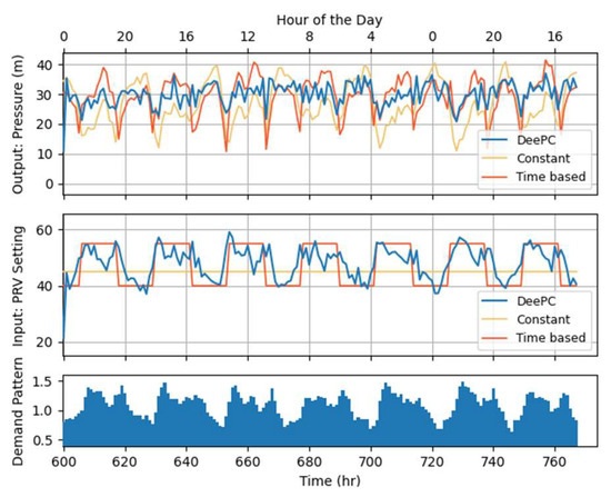 The DMA pressures were optimized over one week with a reference trajectory of 30 m. Additionally, constraints were added to keep the pressure in the range of 25–35 m. The DeePC method was compared to two common control strategies, a constant setting, and a time-based strategy that employs higher PRV settings during the daytime to accommodate increased demands. The input–output trajectories of the three strategies are presented in Figure 2.