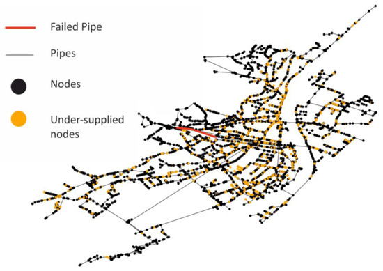 For example, Figure 1 shows the results for a failure of the most critical pipe within the WDN. The demand nodes shaded in orange are impacted (under-supplied—more than 30% of the demand) due to the failure of the pipe (highlighted in red) in this particular scenario. The displayed result illustrates one of the most critical pipe failures in the WDN. The graphical representation depicted in Figure 1 is also illustrated for each pipe failure among the top 5% of failed pipes.