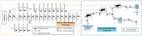 Equation (2) shows the water flow balance requirements for node in the WDN, where and represent the water flow into node from node and reservoir, respectively. represent the water flow from node to node and water flow to the users and tanks at node respectively. Equation (3) illustrates the water head loss caused by the friction in the pipes based on the Hazen–Williams equation [5], where and are the water pressure head at node i and node j, and is the resistance coefficient of pipe i–j. As the coupling components in the WENS, pumps convert electricity to the water head in order to compensate for the water head loss. The water head gained and the power consumed by pumps are shown in Equations (4) and (5), where , are the coefficients of pump u and are the water flow and speed of pump u. The power balance for node i in the PDN is illustrated by Equation (6), where represents the power injection from distributed generator u to node i, is the power demand at node i, and and are the power supply from node i to pump u and the power flow between nodes i and j, respectively. is the set of nodes in the PDN. As indicated by Equation (6), the operator of the WENS can meet the power consumption of the pumps in the WDN and other electricity demand in the PDN by either purchasing electricity from the upstream power grid or generating power with the distributed generators, e.g., microturbines (MTs) or wind turbines (WTs).