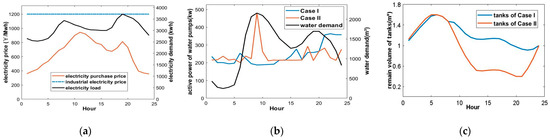 (a) Electricity purchase price from upstream grid, the industrial electricity price for pumps in Case I, and the electricity loads in both cases. (b) Power of water pumps and the water demand in both cases. (c) The remaining volume of water in tanks in both cases.