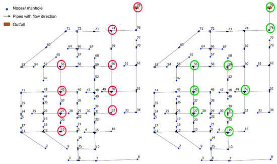 The classic Bayesian approach identified the set of candidate nodes for sensor positioning shown in Figure 1 (left) and reported in Table 1 (left). The highest values of the contamination interception percentage are at nodes 78, corresponding with the outfall, 74 (94.87%) and 60 (82.05%), while the lowest one is at node 13 (8.97%).