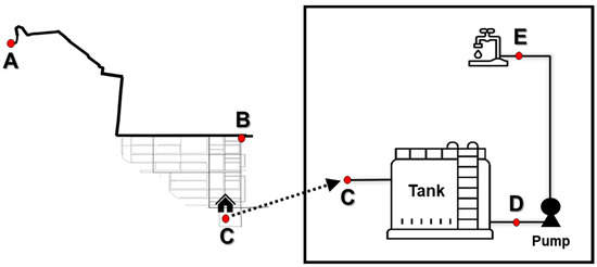 Point A is a reservoir located at an altitude of approximately 96 m, supplying tap water to several medium-sized blocks, including the District Metered Area (DMA) involved in this study. The pipes from the reservoir to the DMA have an average diameter of 1730 mm and are entirely made of steel. Point B is the water inlet of the aforementioned DMA, positioned at the beginning of the DMA, which receives tap water from the reservoir, making it the area that receives water most rapidly. It is located approximately 4.89 km away from the reservoir and serves 594 consumers. Point C, a significant water consumer, is situated approximately 2 km from the DMA’s inlet. The supply pipeline for this consumer has a diameter of 100 mm and is made of polyethylene. The building spans two underground floors and four above-ground floors. At Point C, a tank on the first underground floor supplies tap water, excluding firewater, to the entire building. All tap water used in the building passes through this tank. Point D is located immediately downstream of the tank, where the tap water outflow is measured in real time. The tank dimensions are approximately 9 × 7 × 3 (LWH) m, with the water level maintained at approximately 2 m. The building has four floors, and tap water is pumped from the underground to higher floors through pumps installed at the rear end of the tank. Point E, the tap, is situated in a restroom on the first floor, with the floor height between the underground first floor and the ground floor being approximately 5 m.