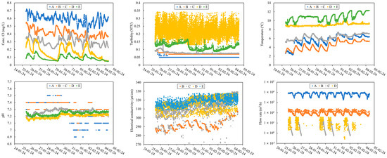 To investigate changes in water composition and correlations between different factors according to the distance traveled, flow meters and water quality sensors were installed at each location to collect real-time data. The data collection period was from 25 January 2024 to 4 February 2024. Data at the reservoir and DMA were collected at 5 min intervals, whereas data at the large consumer inlet, tank outlet, and tap locations were collected at 1 min intervals. The measured parameters were chlorine (Cl), turbidity, pH, electrical conductivity, temperature, and flow rate, with the electrical conductivity and flow rate measurements omitted at the reservoir and tap locations, respectively.