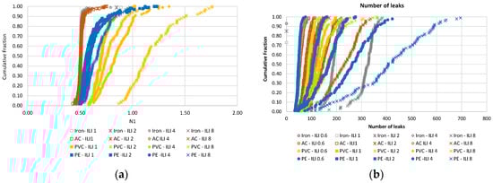 Cumulative distribution of (a) leakage exponents and (b) number of leaks in a typical DMA: variation across different pipe materials and ILIs.