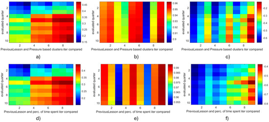 Correlation coefficients for previous lessons and measurable/estimable parameters per quarter. Previous lessons and pressure-based clusters (a–c), and percentage of time spent in a specific cluster (d–f). (a,d) to-max, (b,e) to-min, and (c,f) to-both analysis.