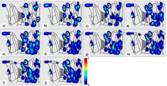 Frequencies of water leak occurrences in each specific pipe per 10 quarters of time explored. to-max analysis, 50 iterations. (a–j) Quarters from quarters 1–10, respectively.