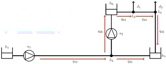 Water distribution networks can be described by four basic elements: pipes, nodes, storage tanks, and actuators such as pumps or controllable valves. The resulting model and the derivation of this model that we will use in this brief paper are illustrated in []. The demand nodes represent the locations in the network where water leaves the network.