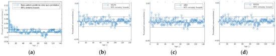 where is the standard deviation at time-of-day instance . Given that the autocorrelation in Figure 2a only details a noticeable correlation in the first lags, these models will only predict the next 14 demand offsets. The autocorrelations of the three AI methods are shown in Figure 2b–d, where a clear reduction in the initial correlation is visible.