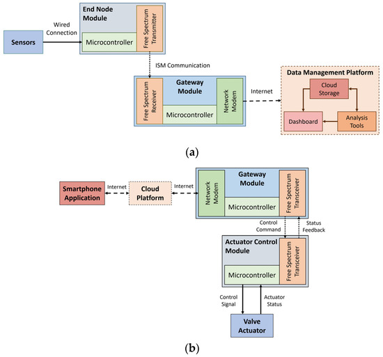 Figure 1. Architecture: (a) WDN monitoring system; (b) WDN control system.