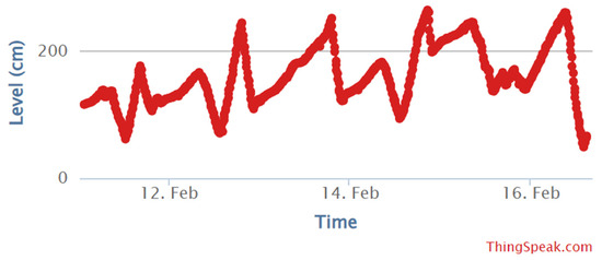 The WDN monitoring system has been implemented in the IIT Madras academic campus at various locations, which includes overhead tanks on buildings, groundwater sumps, domestic households, etc. Real-time level data are being recorded using ThingSpeak, and the data are used to identify patterns in the system. The level data along with vibration data from the pipelines are used to estimate and quantify the flow of water without using the traditional flow sensors. Figure 2 shows a data dashboard field in ThingSpeak platform showing real-time level data. The vibration data acquired from pipes using gyroscope sensors were found to be effective in determining the flow through the pipelines when used in association with the level data from reservoirs.