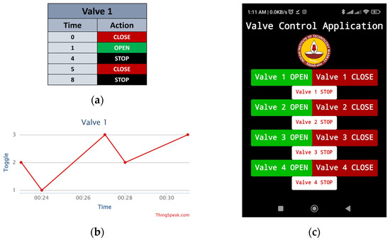 Figure 3. (a) Valve control schedule. (b) Valve status toggle graph in ThingSpeak. (c) Android application for valve control.