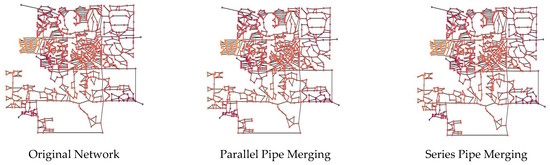 This paper used the FiveRes network as a case study to demonstrate the impact of different skeletonization methods on the network’s topology. Results from E-Town were referenced to explain the effects of skeletonization on network attributes and hydraulic characteristics. The skeletonization techniques were abbreviated as parallel pipes merging (SP), branch pipes trimming (SB), series pipes merging (SS), combination of branch pipes trimming and parallel pipes merging (SBP), combination of branch pipes trimming and series pipes merging (SBS), and combination of series and parallel pipes merging (SSP).