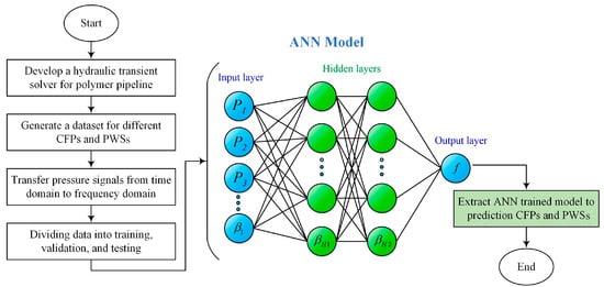 The initial 300 data points were selected as inputs for the ANN model from the frequency domain pressure signals. Out of the entire dataset of 2000 records, 70% (1400 data) were randomly chosen for training, 15% (300 data) for validation, and the remaining 15% (300 data) for testing the model. After training the model and assessing its accuracy using statistical parameters, its performance was further evaluated in detail using two additional datasets. Figure 1 shows the overall workflow of the methodology utilized.