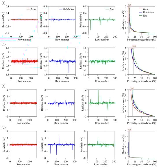 Training, validation, and testing residuals and absolute errors for (a) j1; (b) j2; (c) j3; (d) a.