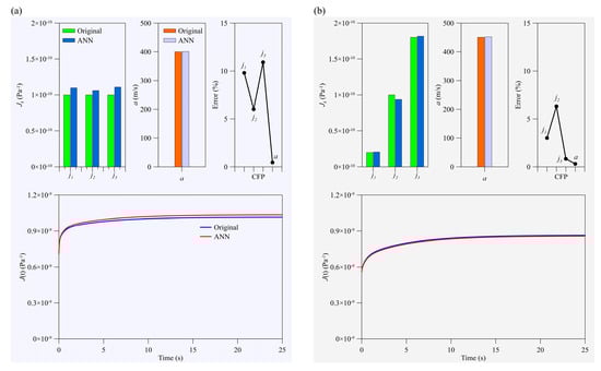 Two new tests are considered to evaluate the trained ANN model. In Test #1, the values of jk and a are as follows: Pa−1 and m/s. In Test #2, they are as follows: Pa−1, Pa−1, Pa−1, and m/s. The time and frequency domain pressure signals of these two tests are shown in Figure 3. Figure 4 displays the original and predicted values of the CFPs and PWSs for both tests. According to the figure, the jk values are predicted with an average error of 6% and an average of 0.4% for both tests. Additionally, comparing the original and predicted creep functions reveals that the trained ANN model estimation accuracy is appropriate.