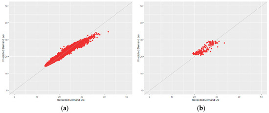 Predicted vs. recorded demand for DMA I (in L/s). (a) Training results, (b) testing results.
