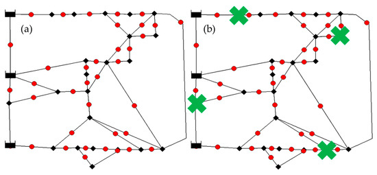 combination was tested by varying from 1 to . Starting from the minimum number of sensors, an exhaustive approach was used, increasing until an acceptable computational cost and localized loss rate was reached. The procedure described in Section 2.1 was applied for each sensor combination to evaluate its leakage localization capability. The result for is the configuration shown in Figure 1b, which is able to identify 78% of the simulated ruptures.