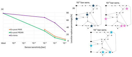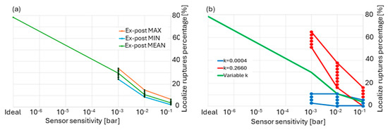 The results in Figure 2a were obtained considering ruptures varying in size and in position. It is shown how reducing instrument sensitivity also causes a decrease in localization capability. For the sensor combination obtained in Section 2.2, the detection capability ranges from 78% for ideal sensitivity to 30% for 0.001 bar, 11% for 0.01 bar, and 4% for 0.1 bar.