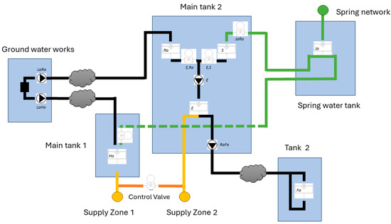 A simplified view of the optimization model consisting of the two boundary nodes, i.e., groundwater works (left) and spring water input node (right); two main storage tanks where the water is mixed; three pumping stations; and the two main demand zones is shown in Figure 1. The cloud symbols indicate the parts of the hydraulic model that were replaced by neural networks.