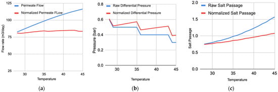 Effect of feed temperature variations. (a) Normalized and permeate flow; (b) normalized and raw differential pressure; (c) normalized and raw salt passage.