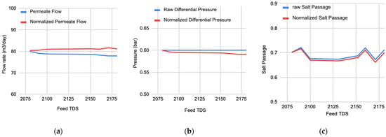 Effect of feed TDS variations. (a) Normalized and raw permeate flow; (b) normalized and raw differential pressure; (c) normalized and raw salt passage.