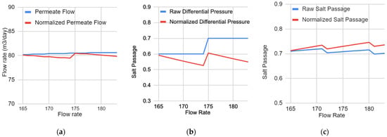 Effect of feed flow variations. (a) Normalized and raw permeate flow; (b) normalized and raw differential pressure; (c) normalized and raw salt passage.